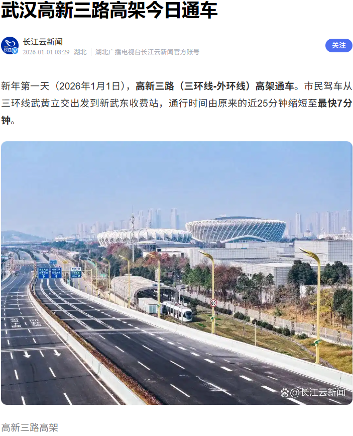 2026年1月1日,由武漢市政院參與設(shè)計(jì)的高新三路(三環(huán)線~外環(huán)線)改造提升工程主線高架通車(chē)!這條西起三環(huán)線武黃立交、東至新武東收費(fèi)站,總長(zhǎng)10.7公里(其中主線高架8.23公里)的交通大動(dòng)脈,以“主線高架+地面輔道”的立體格局,打通了光谷東向通行瓶頸,也承載著武漢市政院在綠色建造領(lǐng)域的技術(shù)突破,為武漢智慧交通建設(shè)樹(shù)立了新標(biāo)桿。